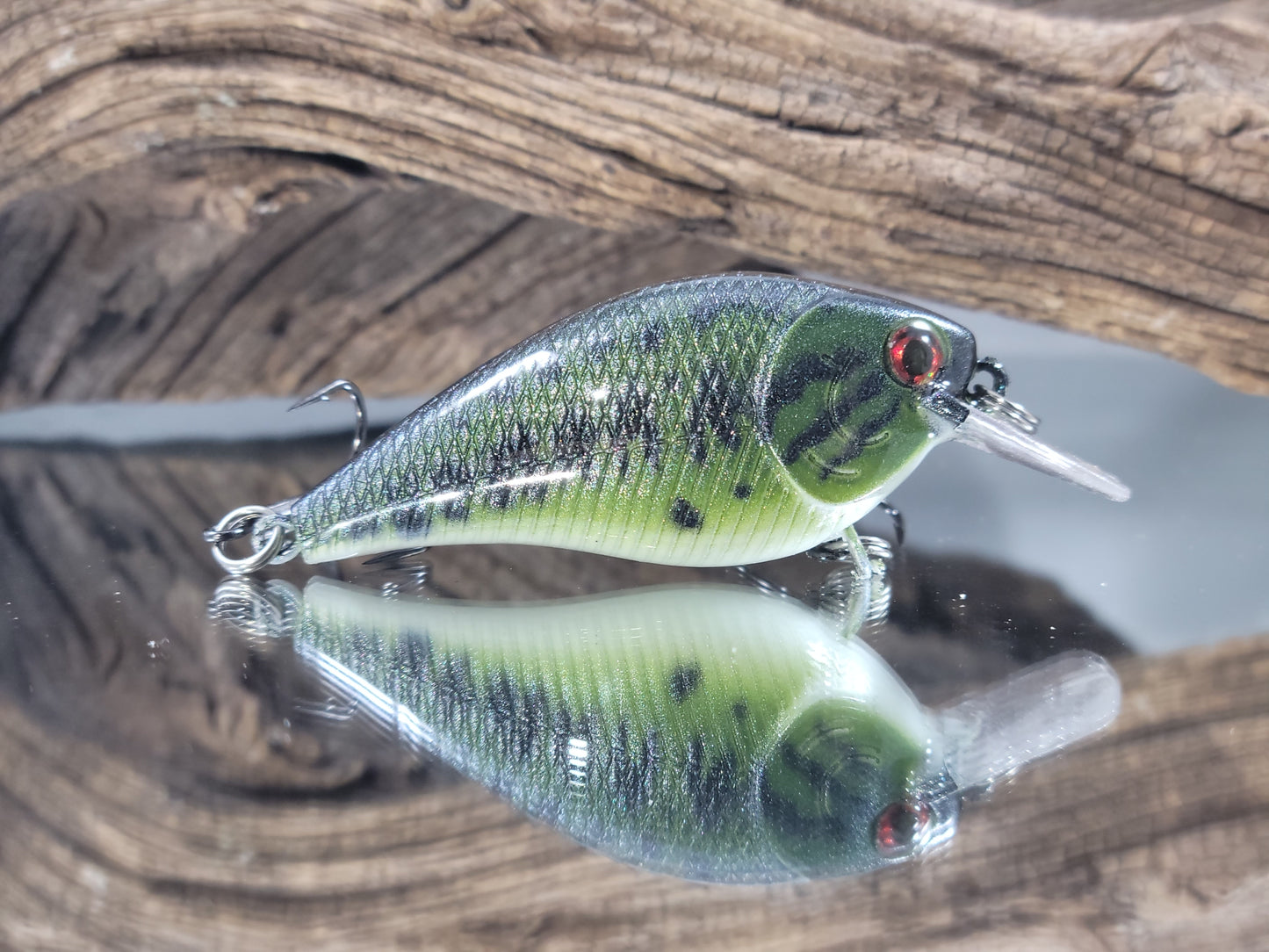 1.5 Squarebill Crankbait in largemouth bass pattern: This classic 1.5 body crankbait is the perfect shallow water workhorse. Measuring 2 3/4 inches and weighing 1/4 oz, it dives to a depth of 2-4 feet. Equipped with US-made stainless steel splits and KVD needlepoint Trebles, this lure is built to run true and has a realistic Largemouth Bass pattern with lifelike eyes to fool even the wariest fish.