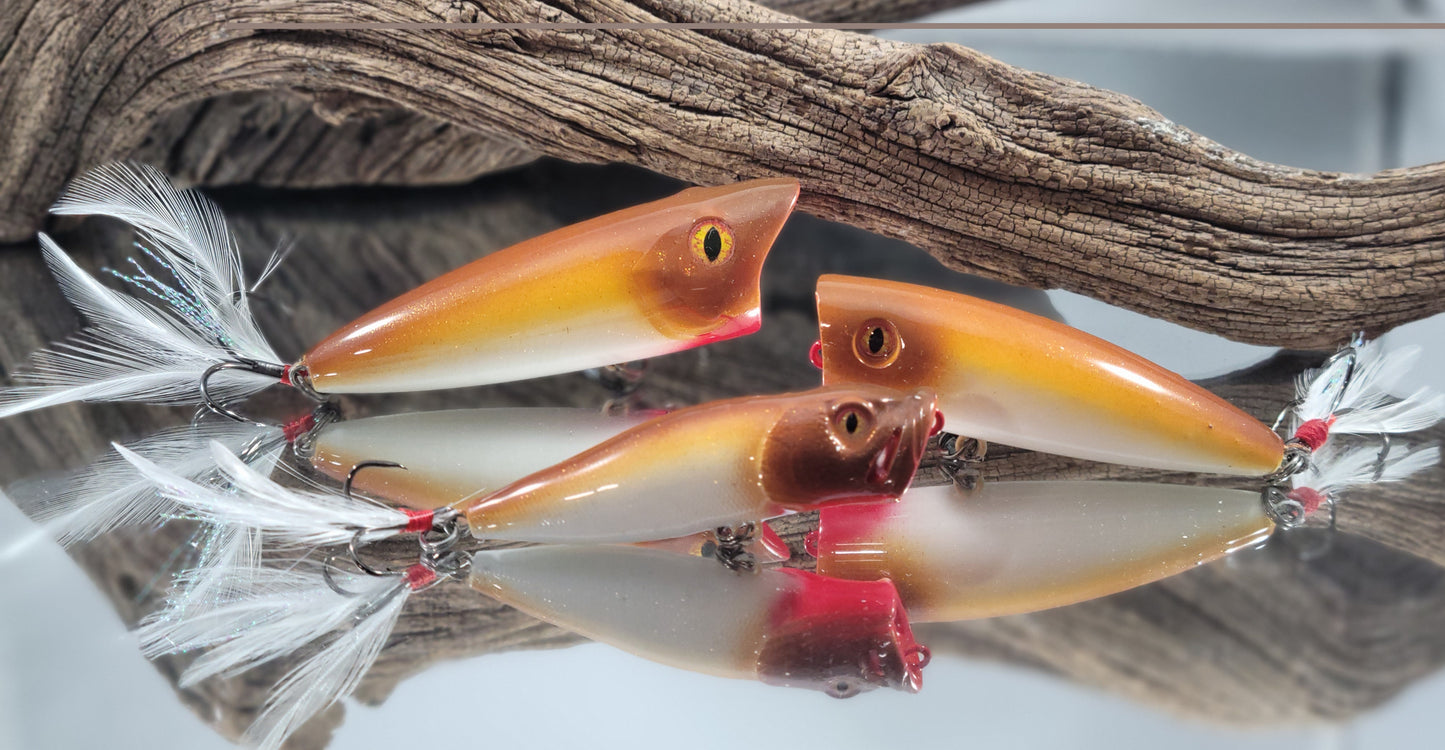 the ultimate Clyde's Cranks "Carmel Cream Topwater Poppers" Bundle, a limited-time collection of three proven lures designed to add variety and uniqueness to your collection of poppers. It features some of the best, and most effective poppers on the market today.